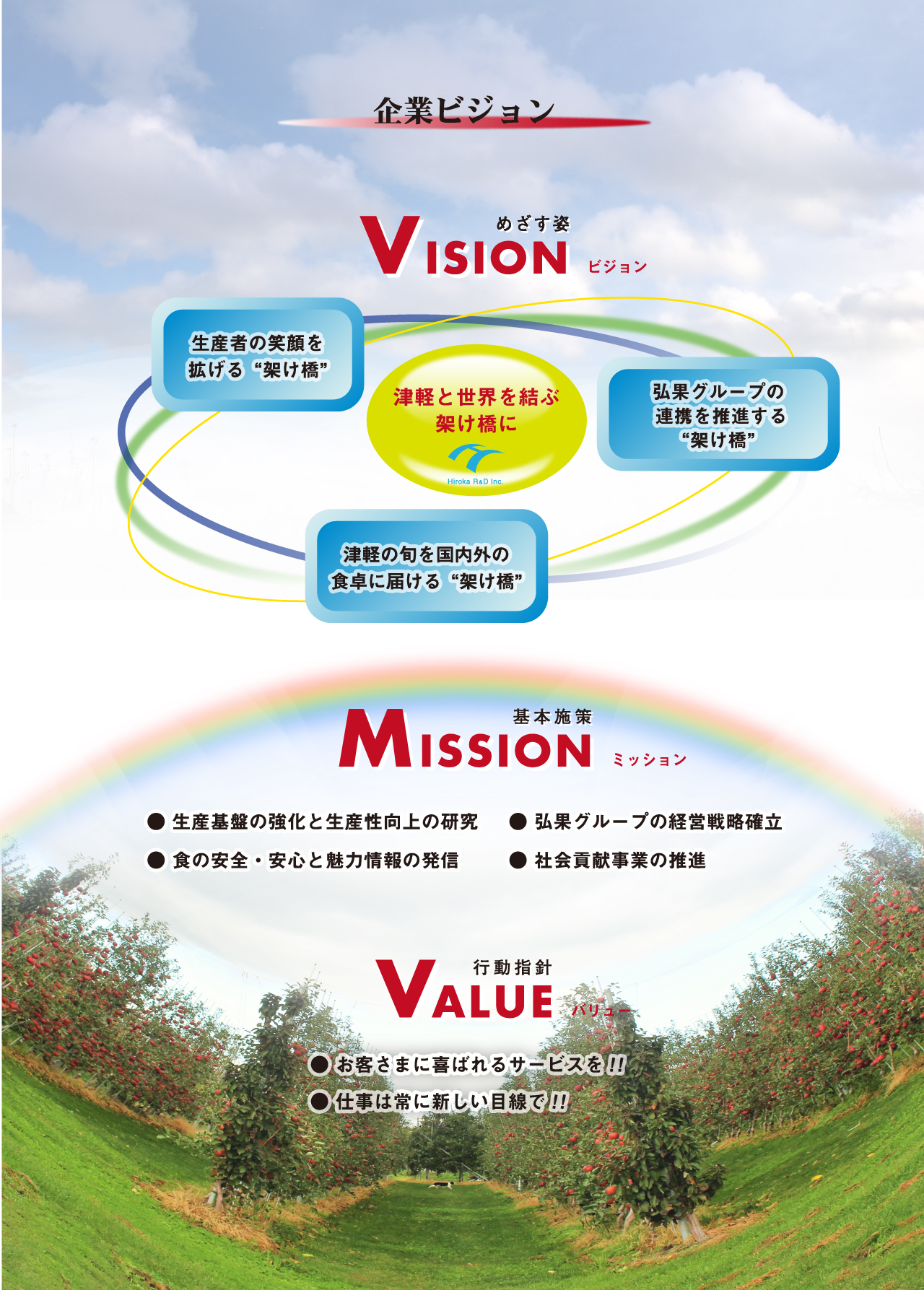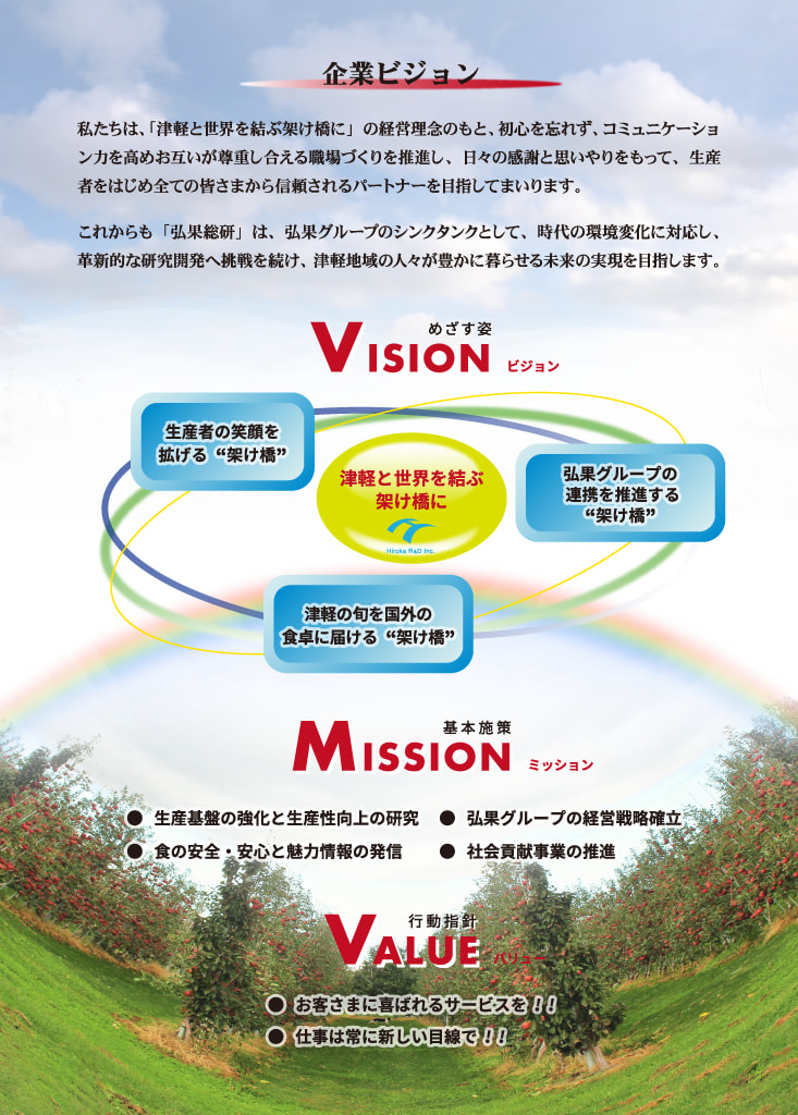 弘果総合研究開発の「めざす姿」、「基本施策」、「行動指針」を紹介します。