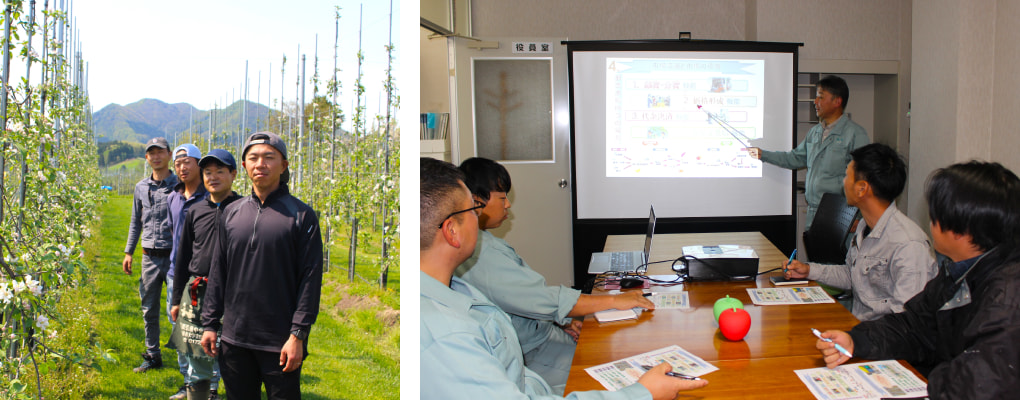 研修生が栽培実習等を通じて、りんご高密植栽培、ハウスぶどう栽培などの有望作物に関する基礎的・実践的な知識・技術を広く習得し、研修終了後の独立就農を目指します。