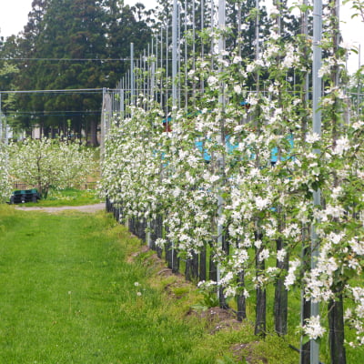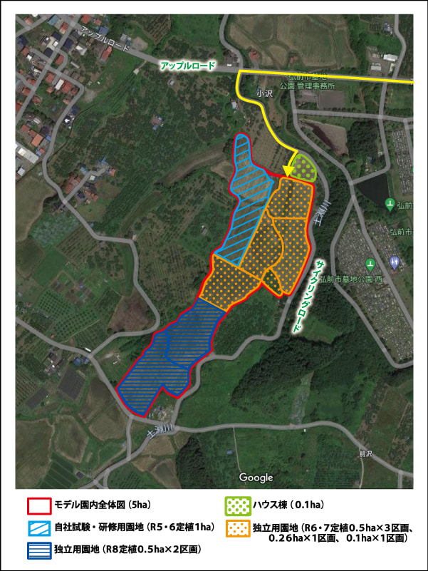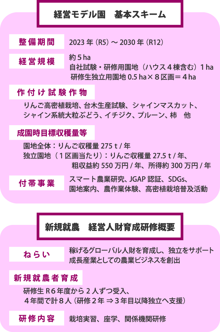 弘果総合研究開発では、2023年(R5)4月に、りんご高密植栽培による経営の優位性を実証し、新規就農者の受入・育成することを目的とした新たなプロジェクト「弘果総研りんご高密植栽培経営モデル園」を弘前市小沢地区に開設しました。