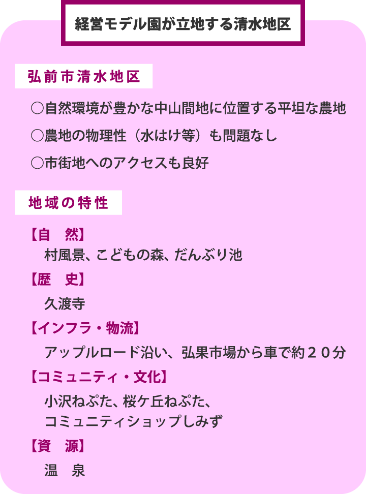 当園では、社員や農業研修生が、ここ清水地区で農業を営みながら、地域の魅力や人々との触れ合いや新たな発見を通じて、農村の活性化に寄与していきます。