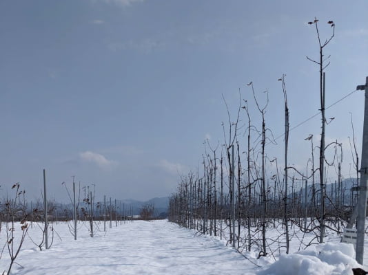 本調査結果から高密植栽培における今後の雪対策は、側枝への堆雪状況に応じて消雪剤を散布することとし、特に、定植1・2年目の幼木の管理に注意を払う必要がある。