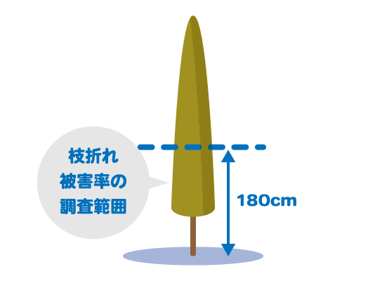・ 確認方法は、標本果樹の主幹長の地面から180㎝(最深積雪相当)までの間の側枝の総本数のうち、枝折れ被害数の割合を算出した。