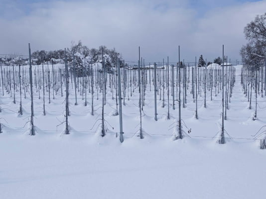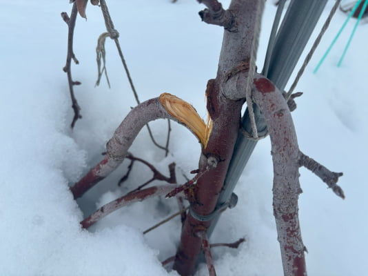 〇地上180㎝を超える部分での枝折れ被害は全ての園地で見受けられず、これは高密植栽培の側枝は細く、地面方向に誘引していることもあり、雪が枝に堆雪しにくいためと思料される。